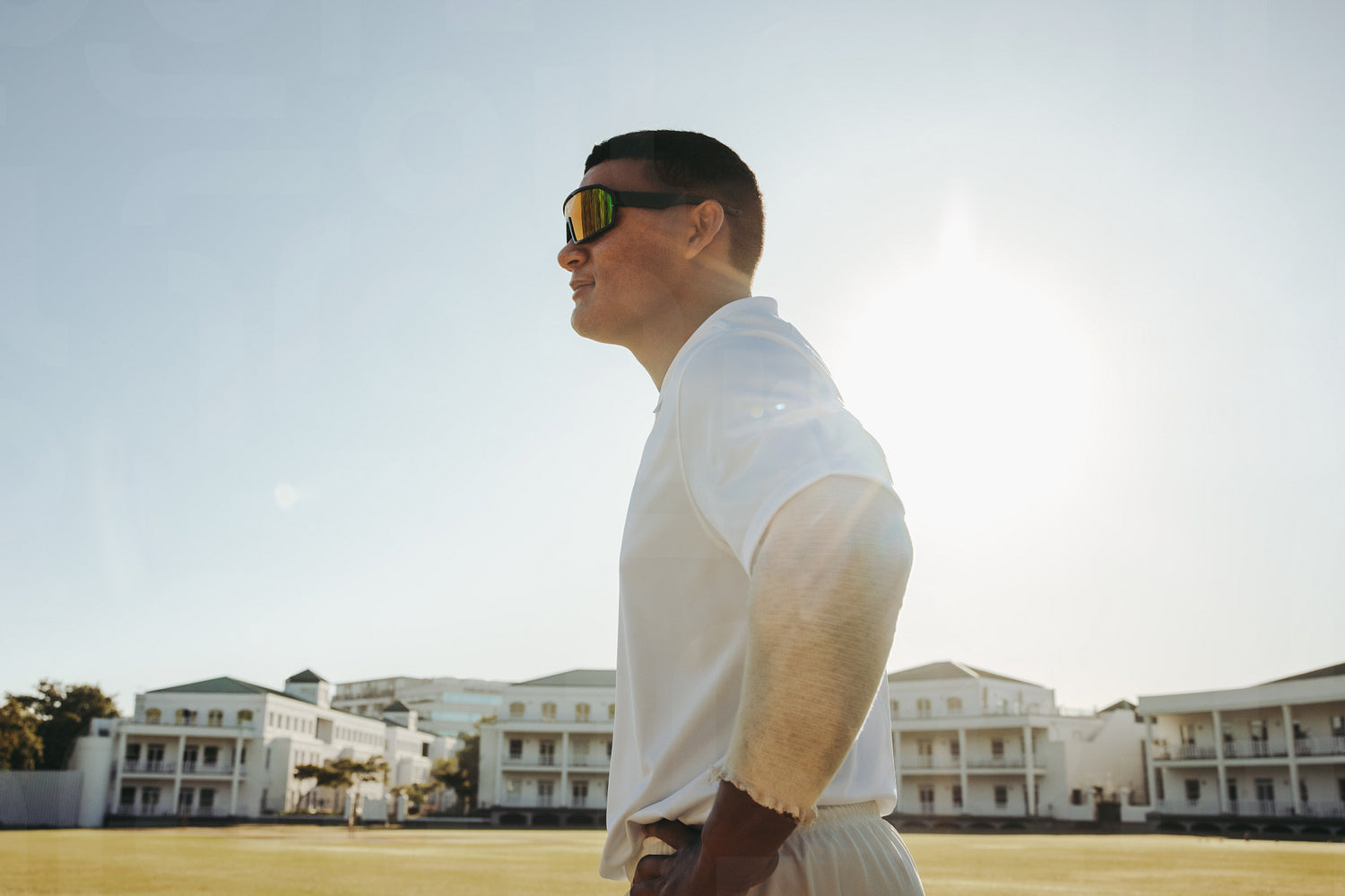 Male cricket player wearing sunglasses standing outdoors on a sunny day