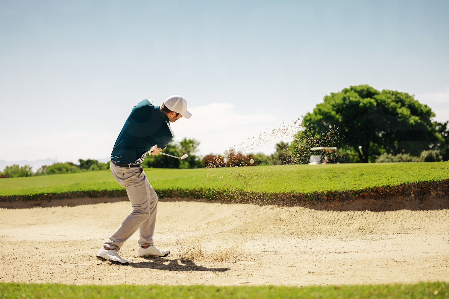 Male golfer skillfully showcasing athletic game techniques and concentration escaping sand bunker