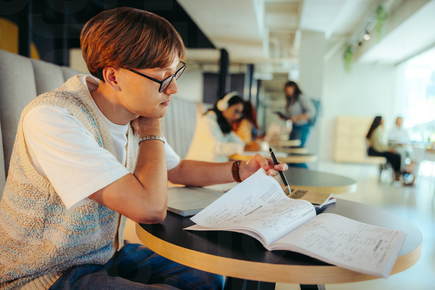 Male high school student studying diligently at a modern library, focused on his notes and assignments
