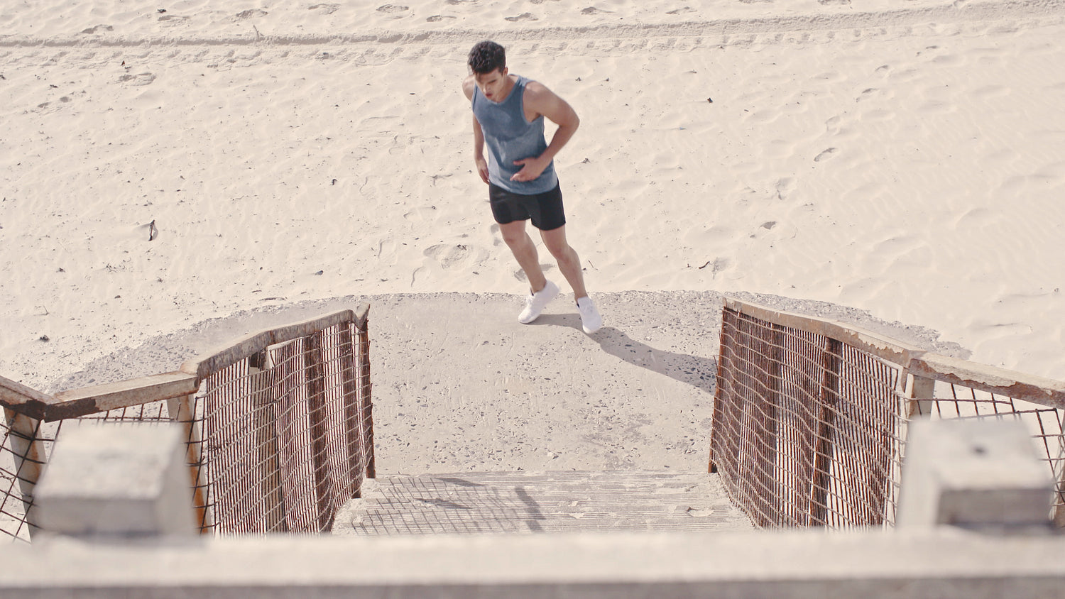Male runner running up the steps on beach