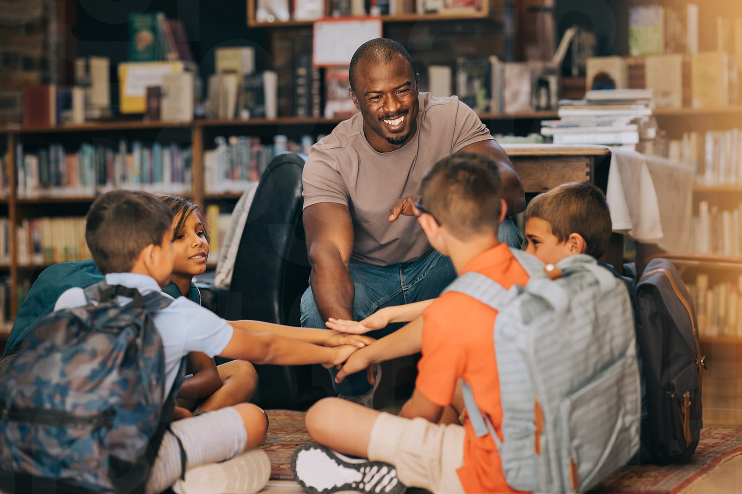 Male school teacher huddling with his students in a library. Man teaching a group of primary school children. Motivation and mentorship in elementary school.