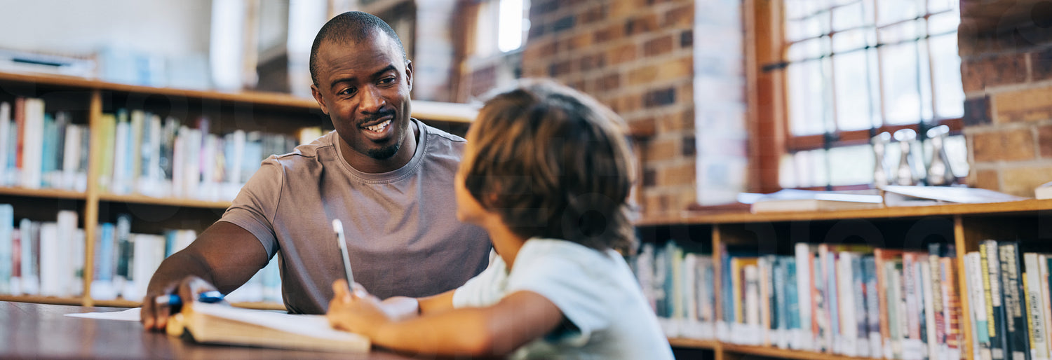 Male teacher counselling a young school boy in a library