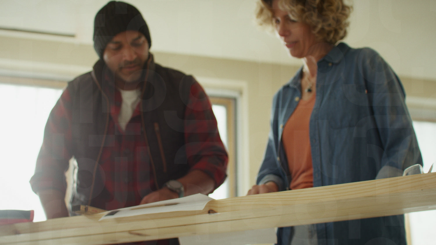 A middle-aged man and woman discuss home renovation plans. The man holds blueprints and a measuring tape while the woman gestures, both standing near lumber.