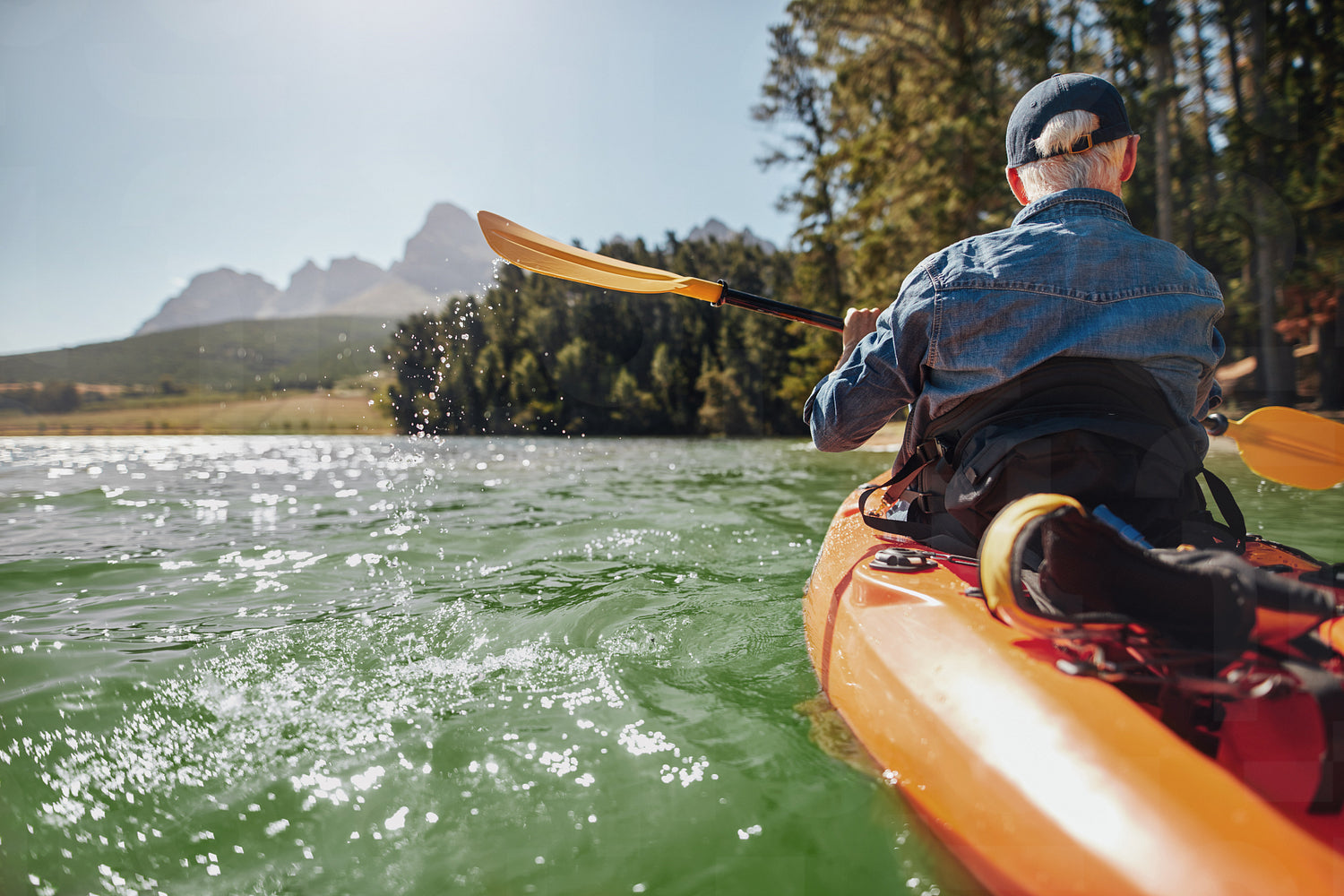 Rear view image of a man canoeing in a lake. Man paddling a kayak on summer day.