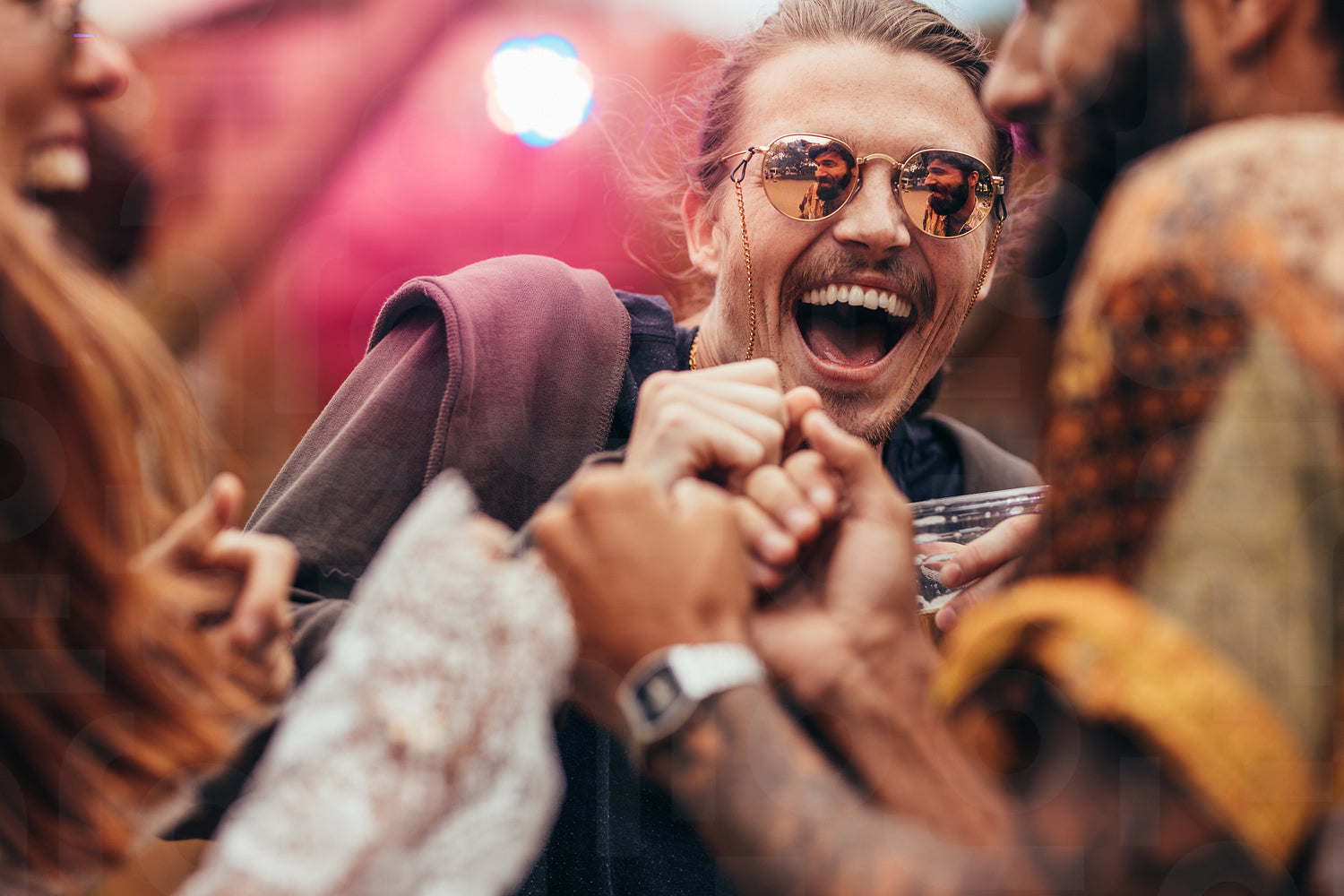Man dancing with friends at music festival.