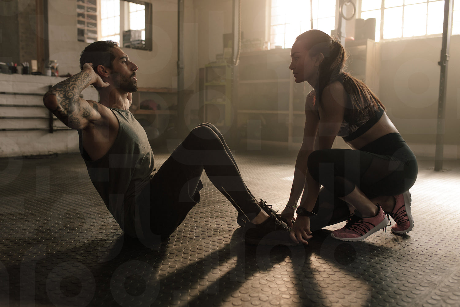 Muscular man doing sit-ups while female fitness trainer holding his feet. Female doing abs exercise with help from a man in gym.