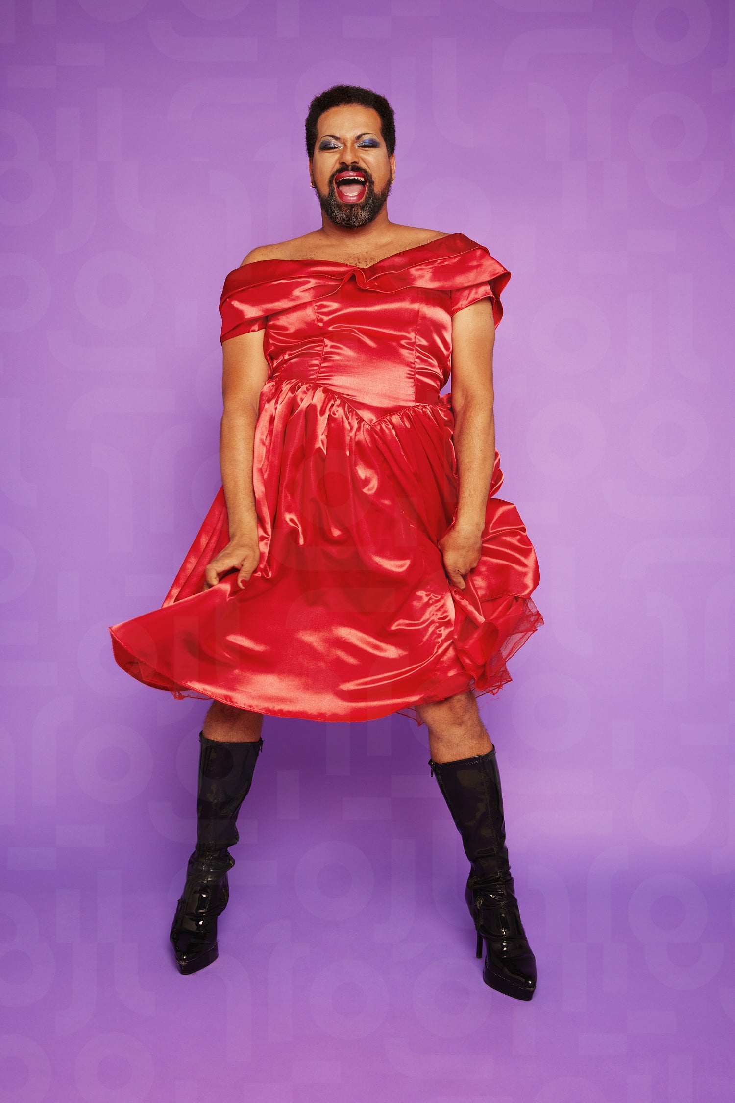 Drag king performing in studio background. Man in drag wearing red shiny dress singing in theater.