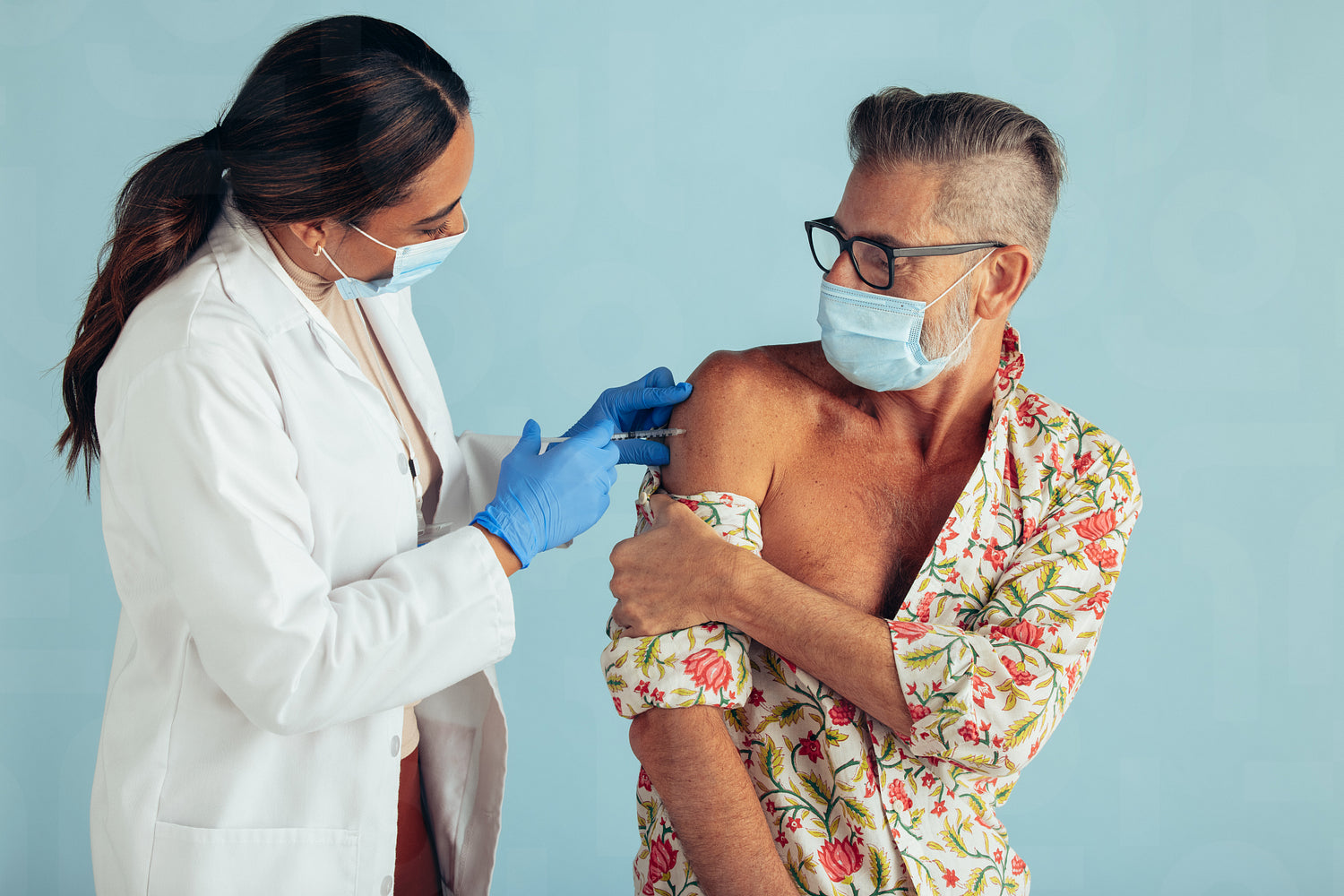 Mature man getting second coronavirus vaccine dose for full immunity. Doctor giving vaccine to a man wearing face mask during pandemic.