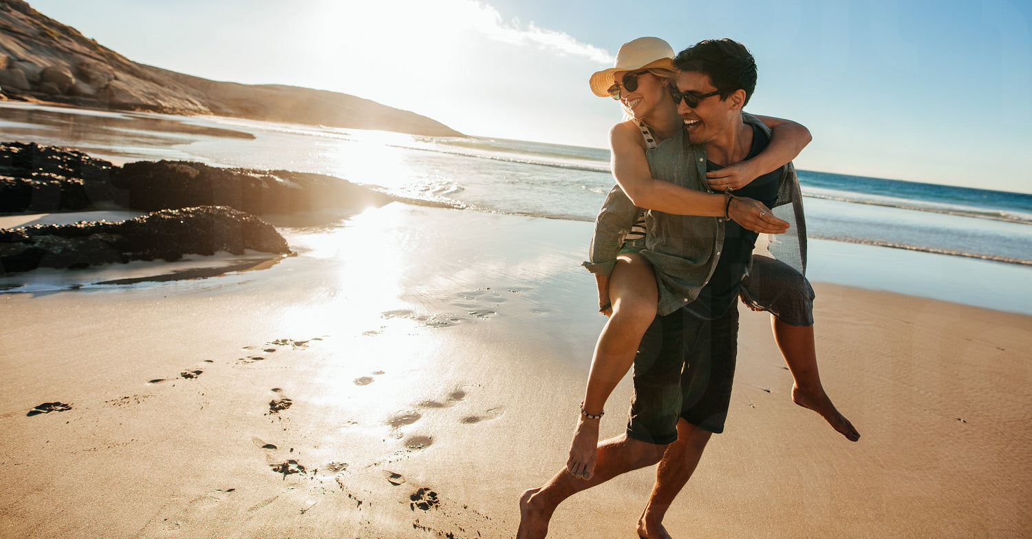 Man giving piggyback ride to girlfriend on beach. Happy young couple having fun on the seashore, enjoying summer holidays.