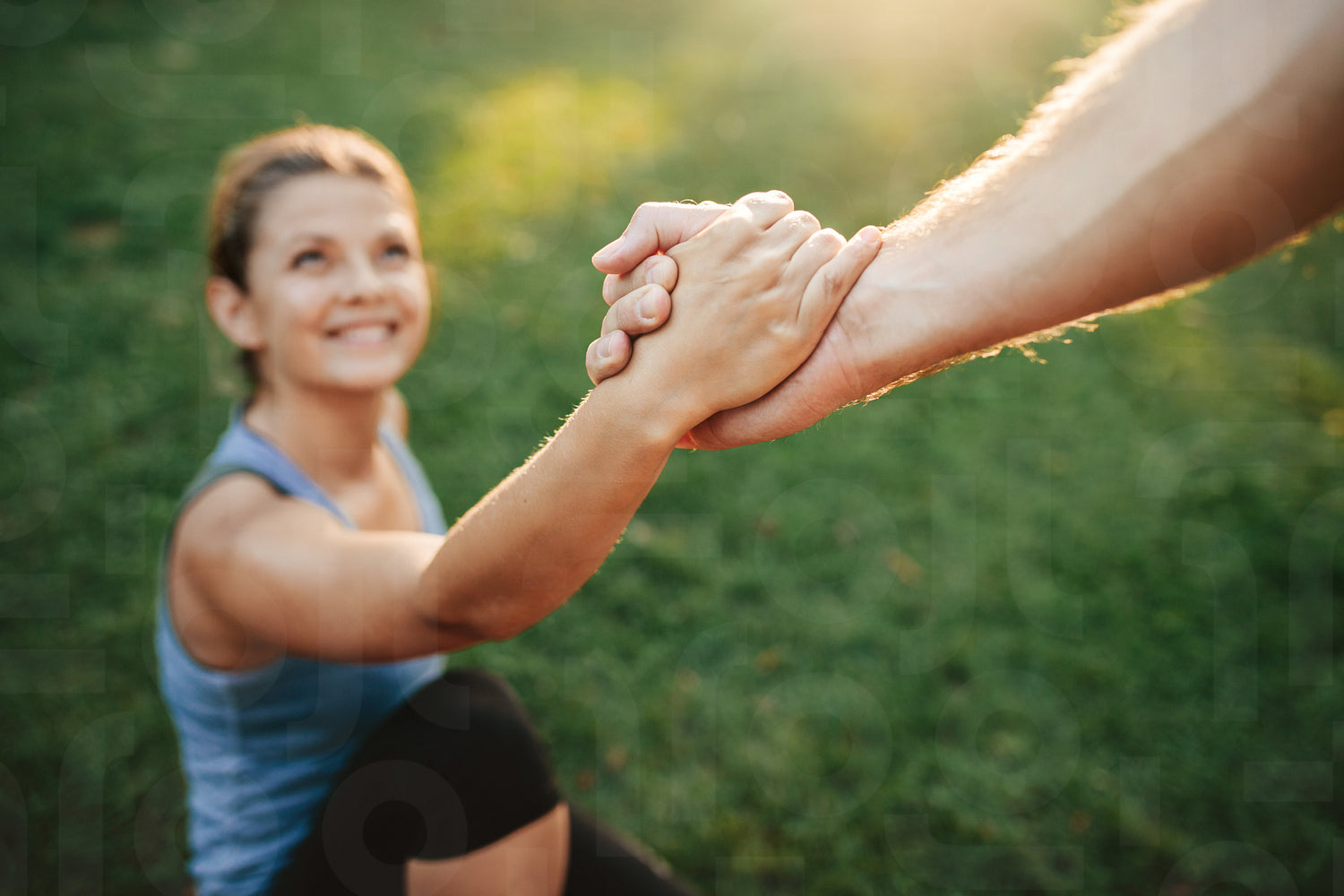Close up shot of man helping woman to stand up. Focus on hands of couple exercising at park.