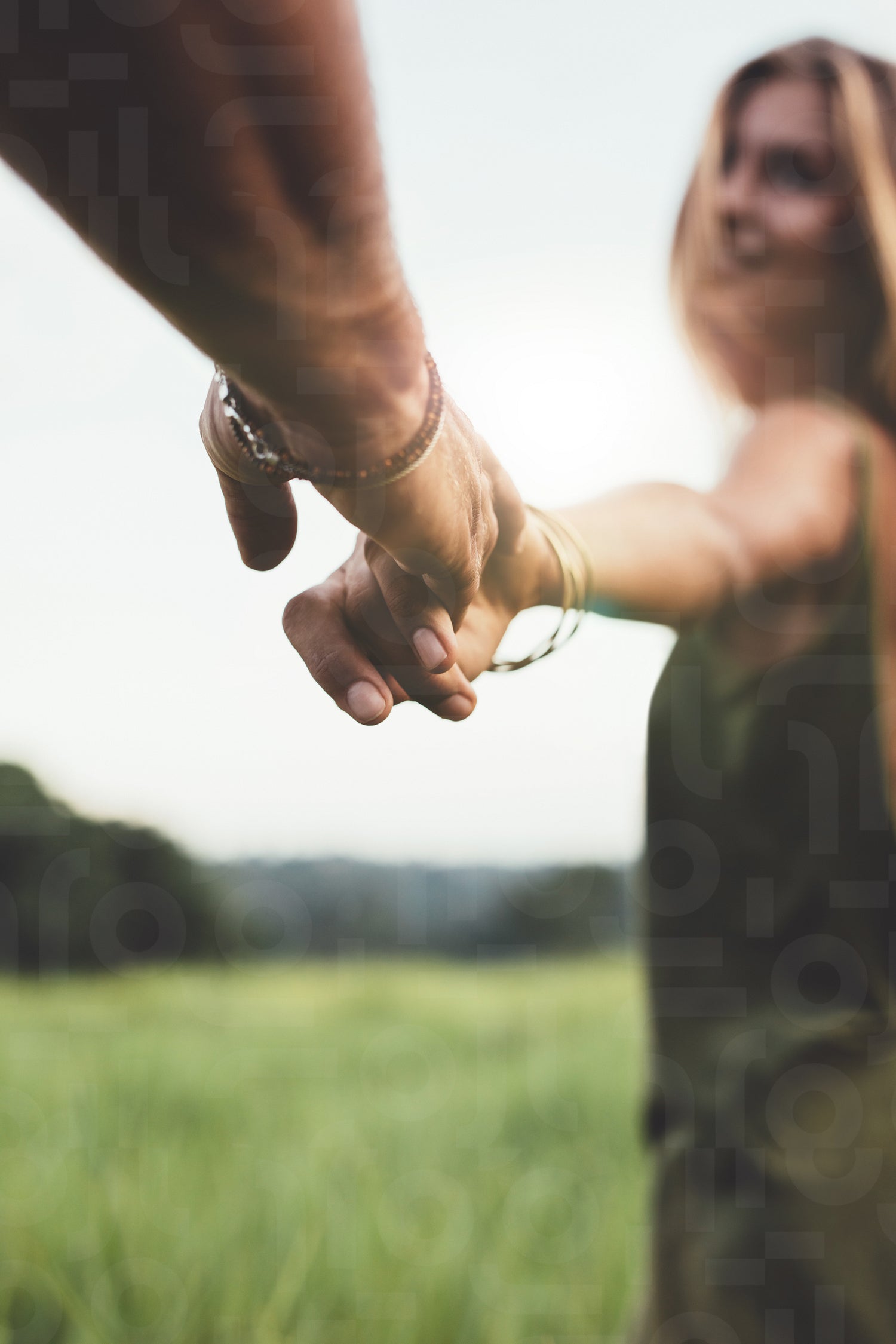 Close up shot of man holding hand of his girlfriend in grass field. POV shot of couple in nature.