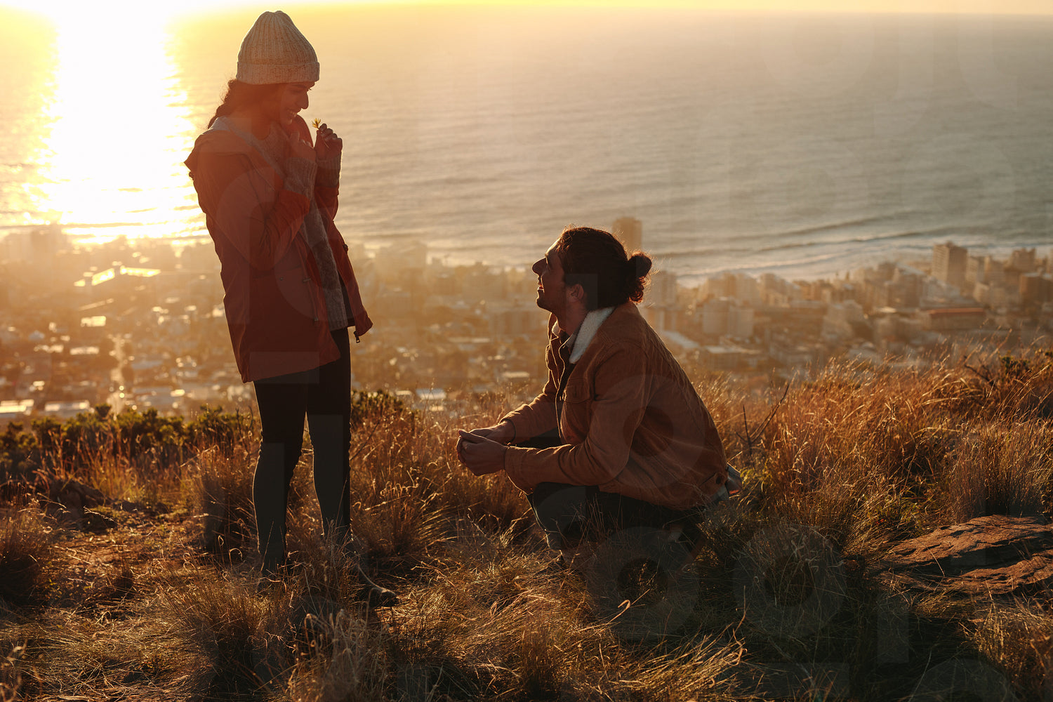 Young man kneeling on ground with female standing by on cliff. Couple in love in mountain with seascape in background.