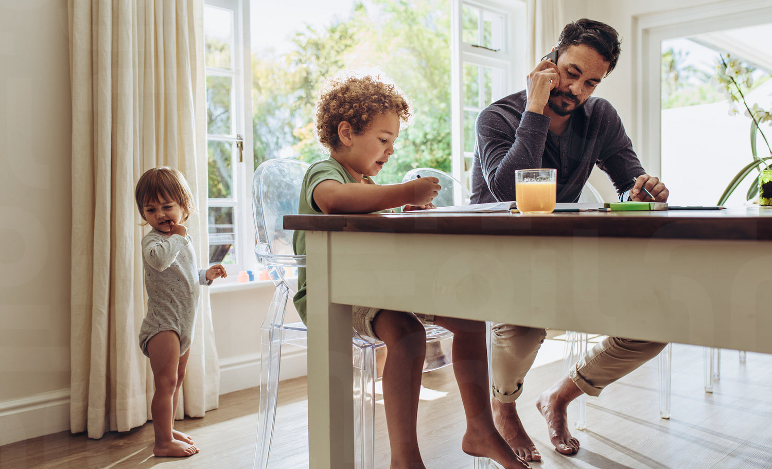 Man sitting at a table and talking over mobile phone with kids engaged in activity. Man working from home and babysitting kids.