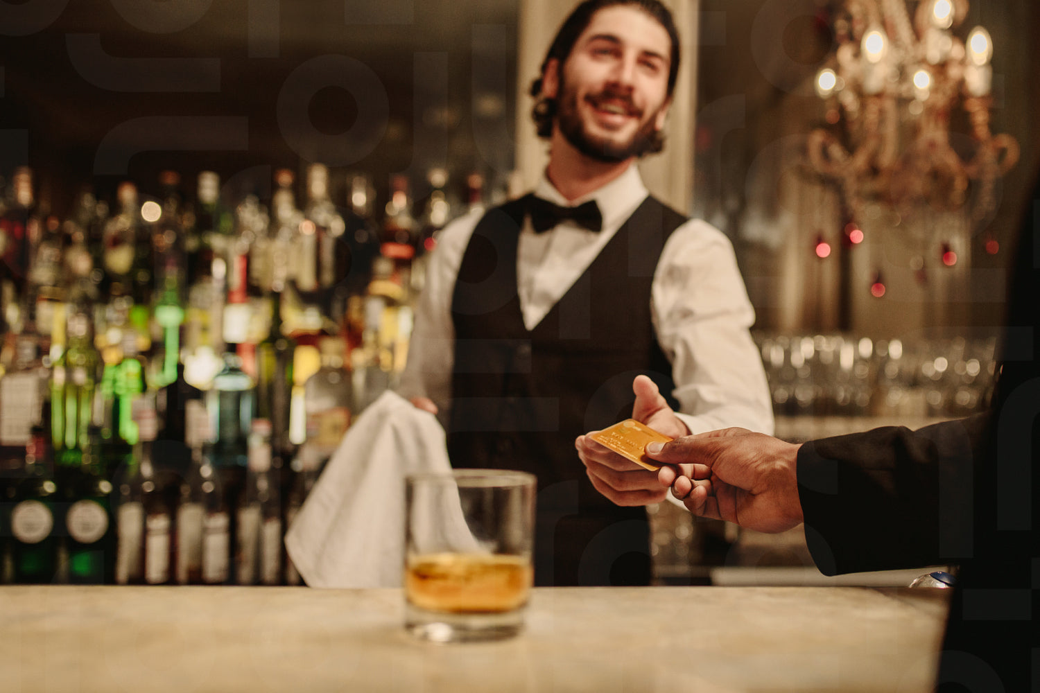 Cropped shot of a male customer giving credit card to barman for bill payment. Man making a cashless payment at nightclub bar.