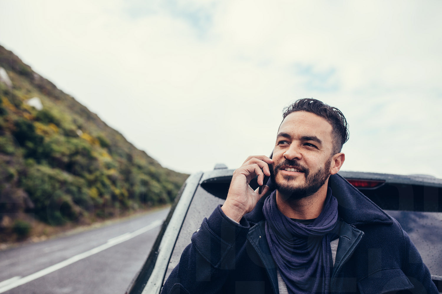 Handsome young man standing outdoors near his car and talking on the mobile phone. Young man on road trip making a phone call.