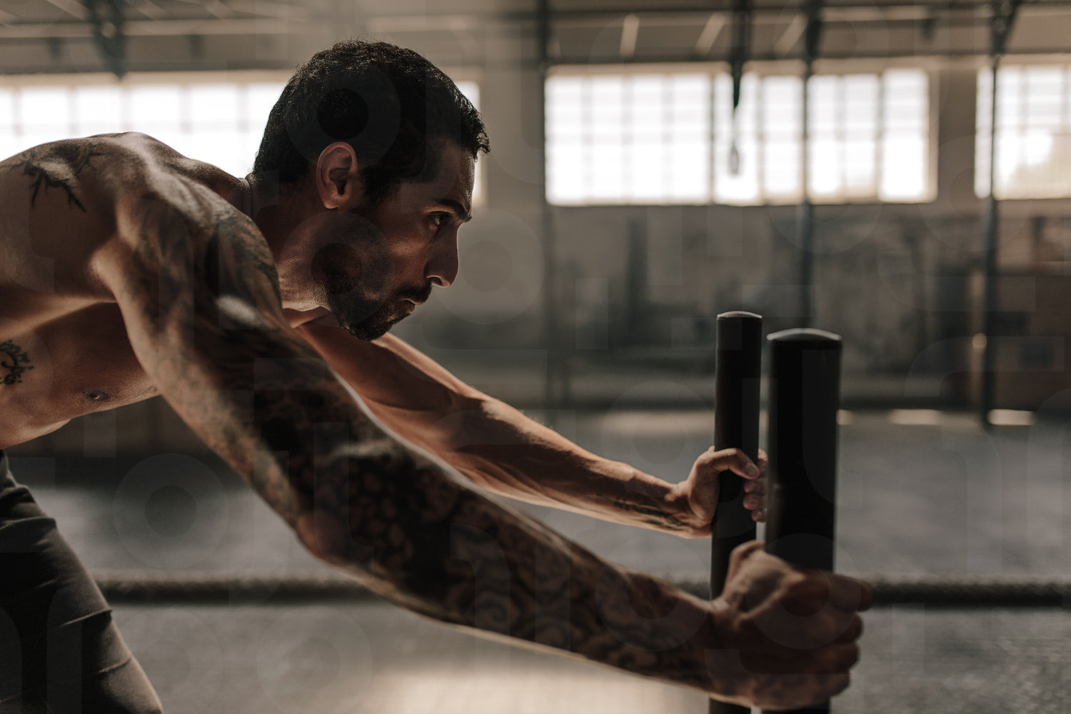 Side view of strong man pushing sled at gym. Athlete performing powerful exercise at cross training gym.