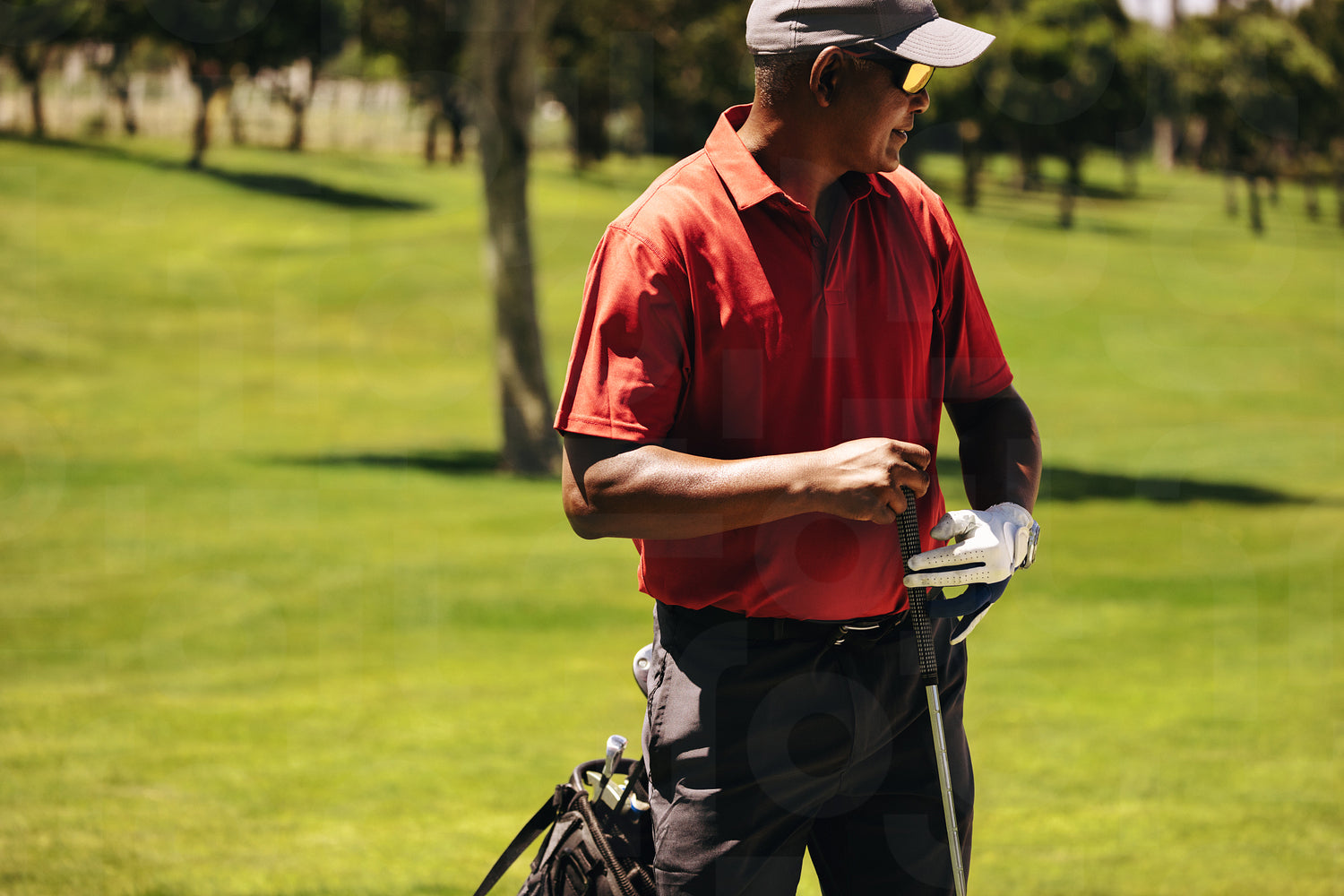 A man thoughtfully planning and selecting his golf club from the golf bag on a sunny fairway, ready to play on the golf course.