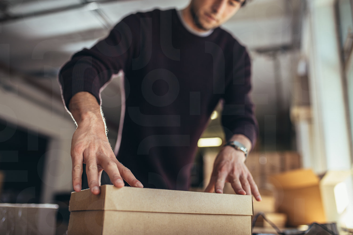 Small business owner packing in the box for shipping. Hands of male entrepreneur preparing a shipment for delivery.