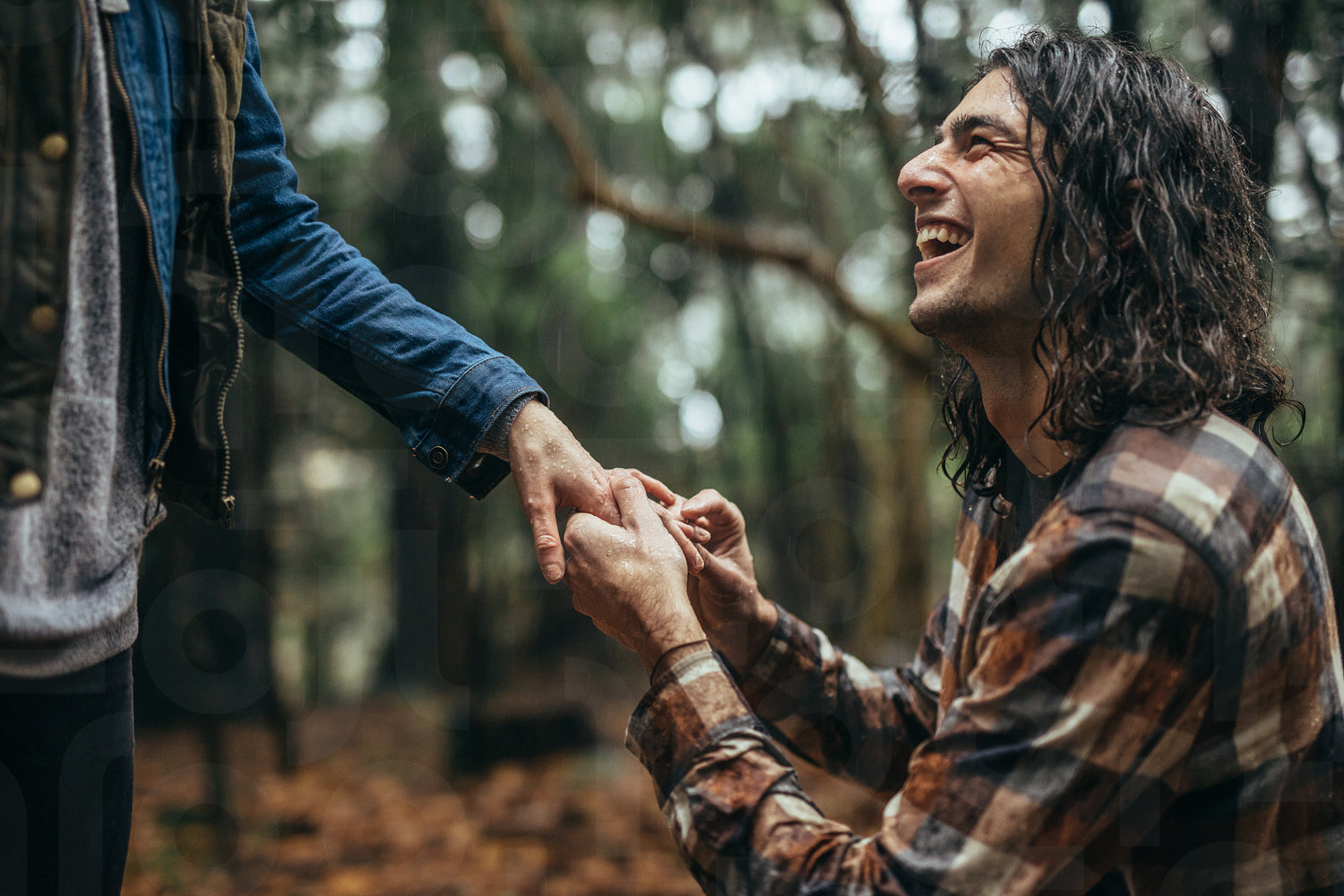 Smiling young man putting engagement ring on woman's hand outdoors under the rain. Cheerful guy making marriage proposal to girlfriend at park.