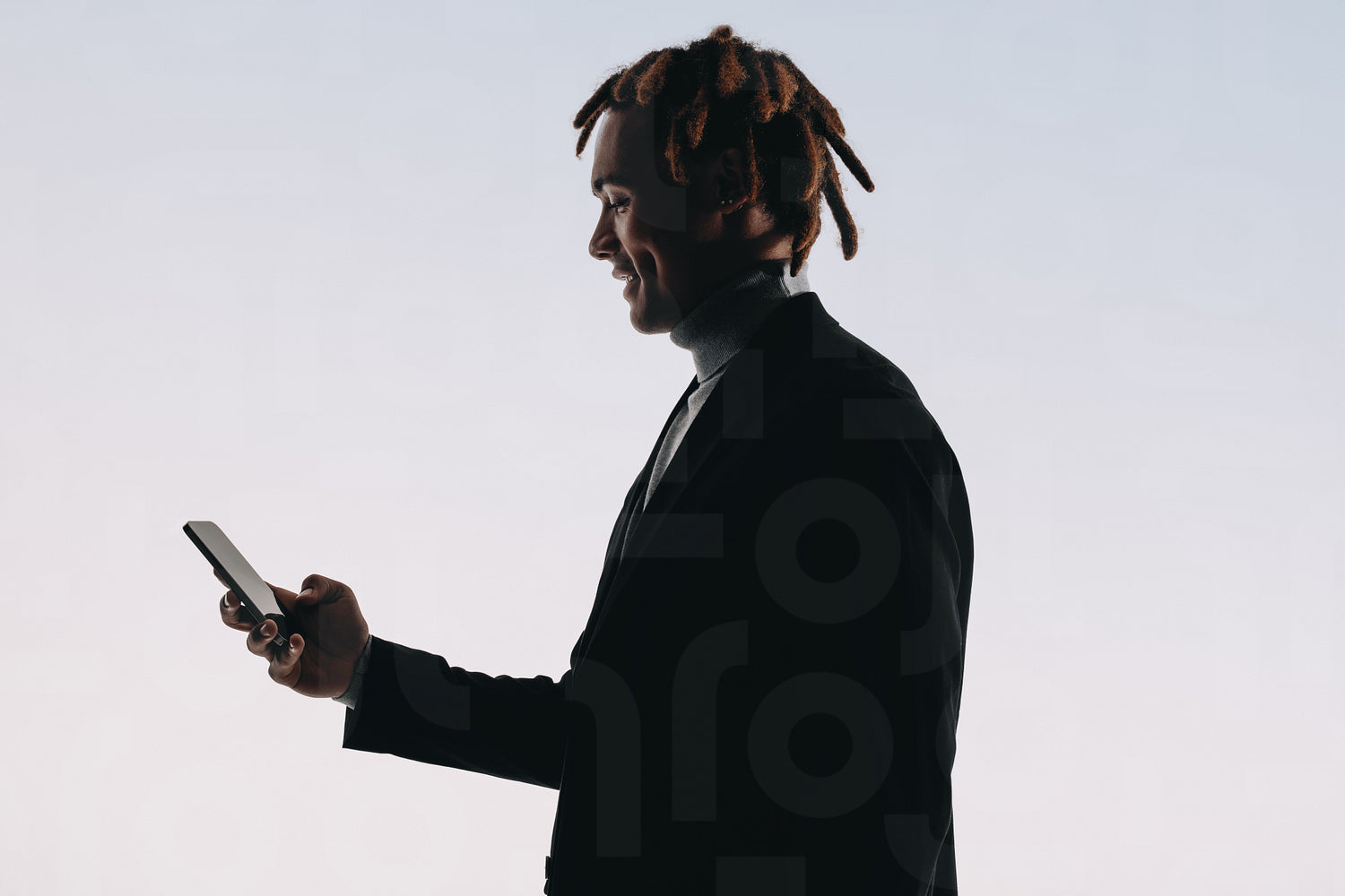 Happy man using a smartphone, reading and texting on a mobile app. Silhouette of a young man highlighting the modern lifestyle of seamless connection and communication against a studio background.