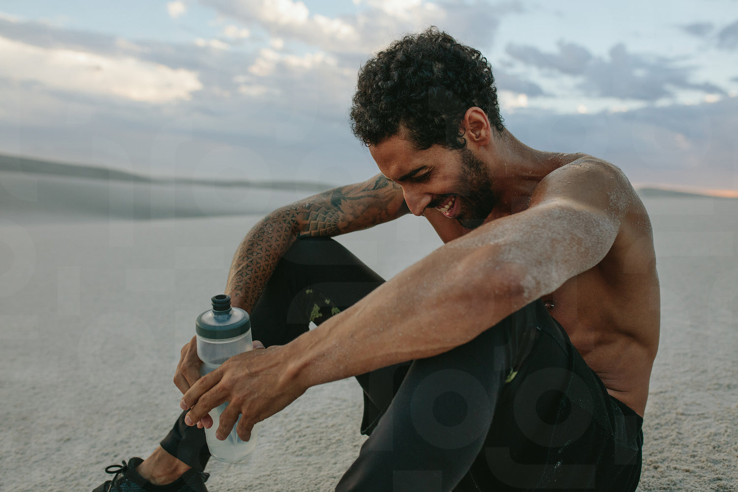 Happy male athlete sitting on sand dune with water bottle and smiling in evening. Man relaxing after exercising in desert.