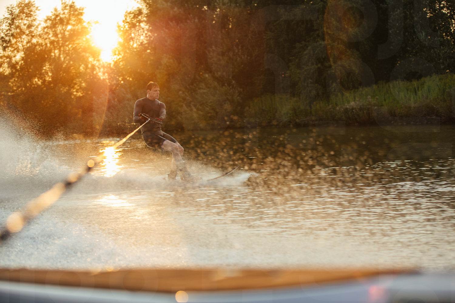 Man riding wakeboard on wave of motorboat in lake at sunset. Male athlete in action, water skiing on lake.