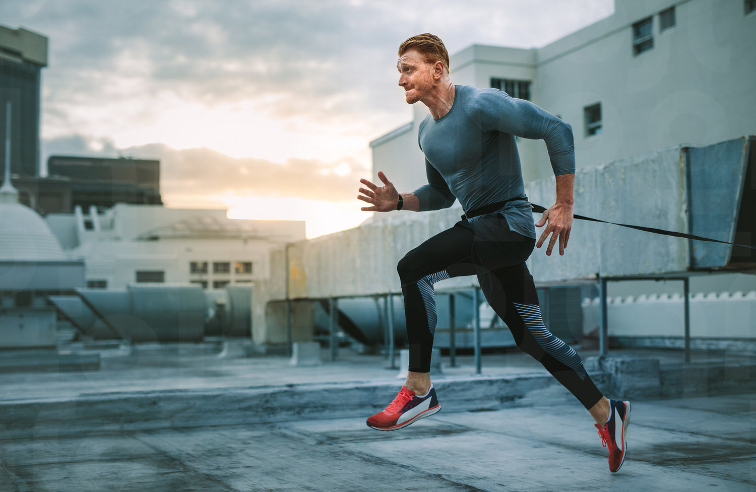 Fitness man running on terrace of a building with a resistance band to his waist. Man doing workout on rooftop doing resistance running.