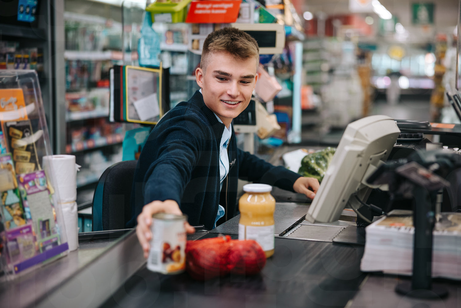 Man serving customers at supermarket checkout. Male sales clerk scanning products at grocery store checkout.