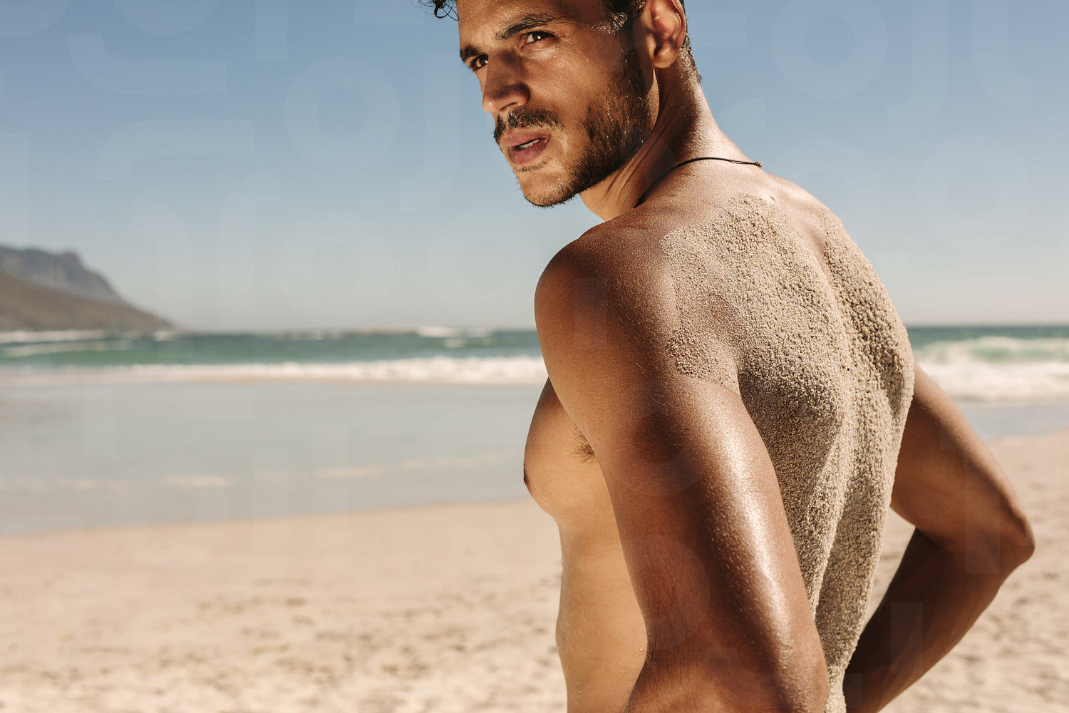 Side view of a bare chested man standing on a beach during workout with sand attached to his back. Athletic man standing on beach relaxing while doing fitness workout.