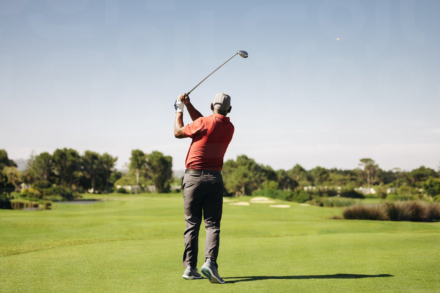 Man swinging golf club in perfect follow through position during an approach shot on a sunny day, capturing the essence of focus and precision in golf.