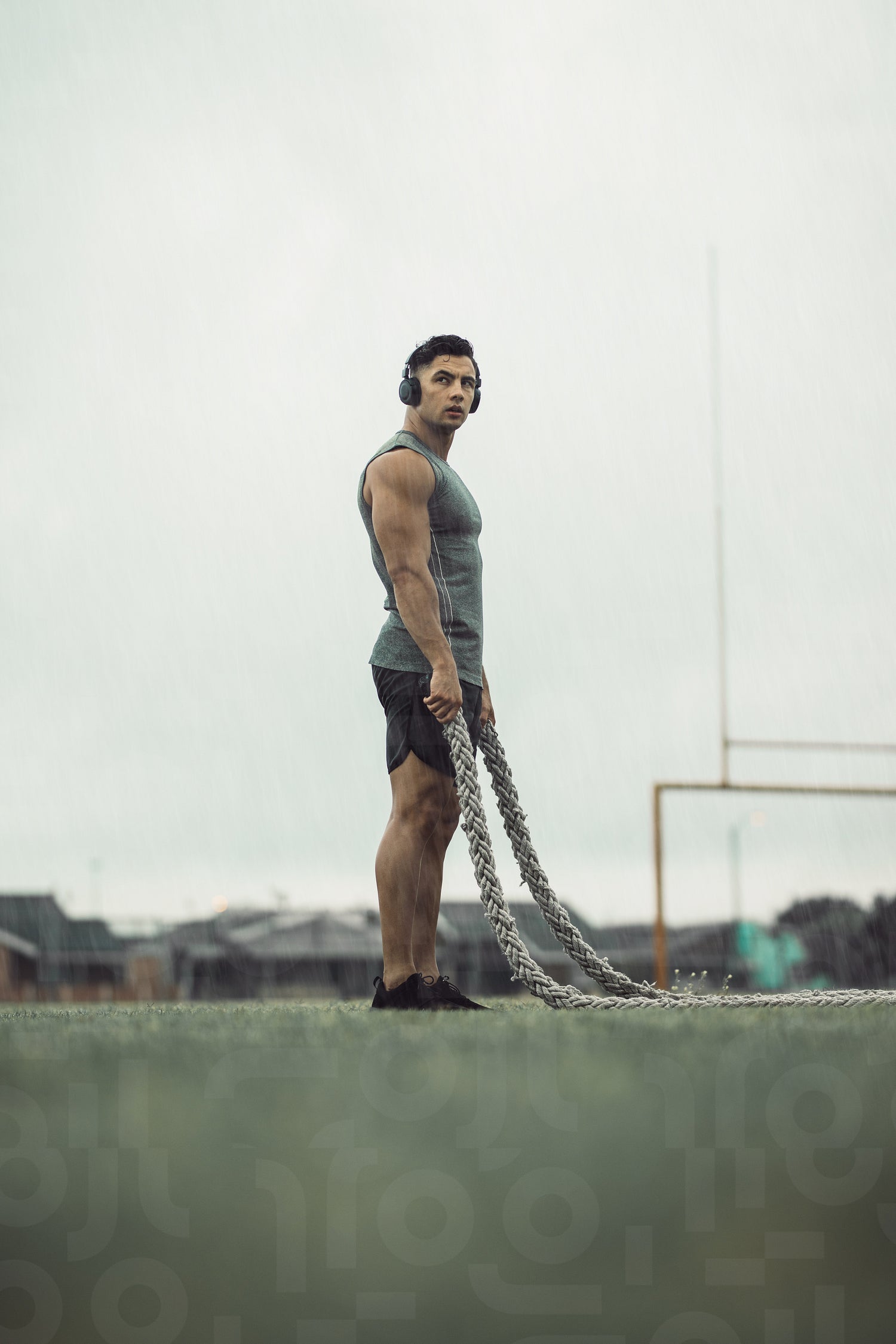Man taking rest from battle rope workout. Muscular man doing fitness workout while it rains with battle ropes on a field.