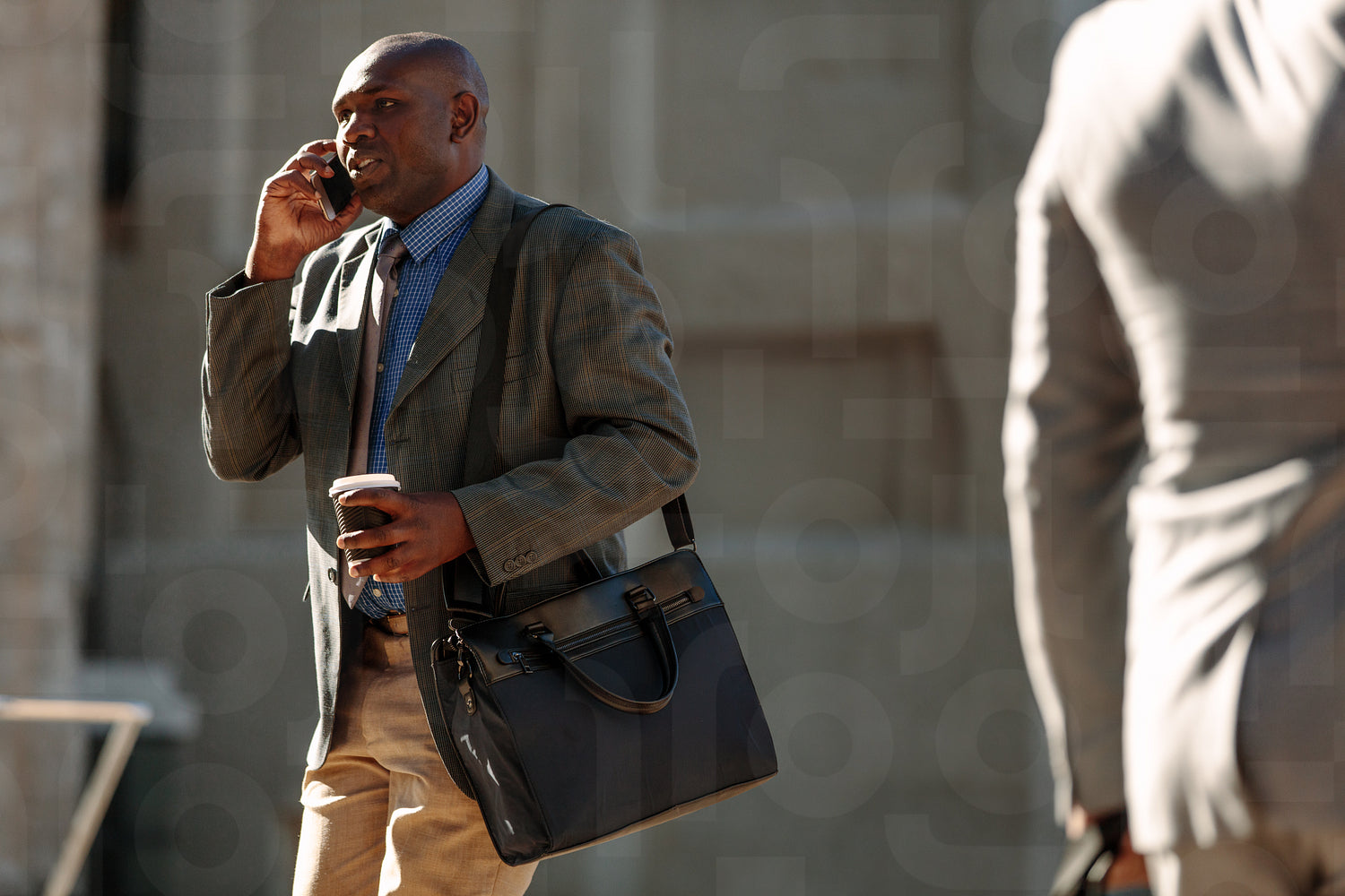 Businessman commuting to office talking over mobile phone with a coffee cup in hand with sun flare in the background. Busy man walking to office carrying his office bag holding and a coffee cup in one hand and talking over mobile phone with the other.