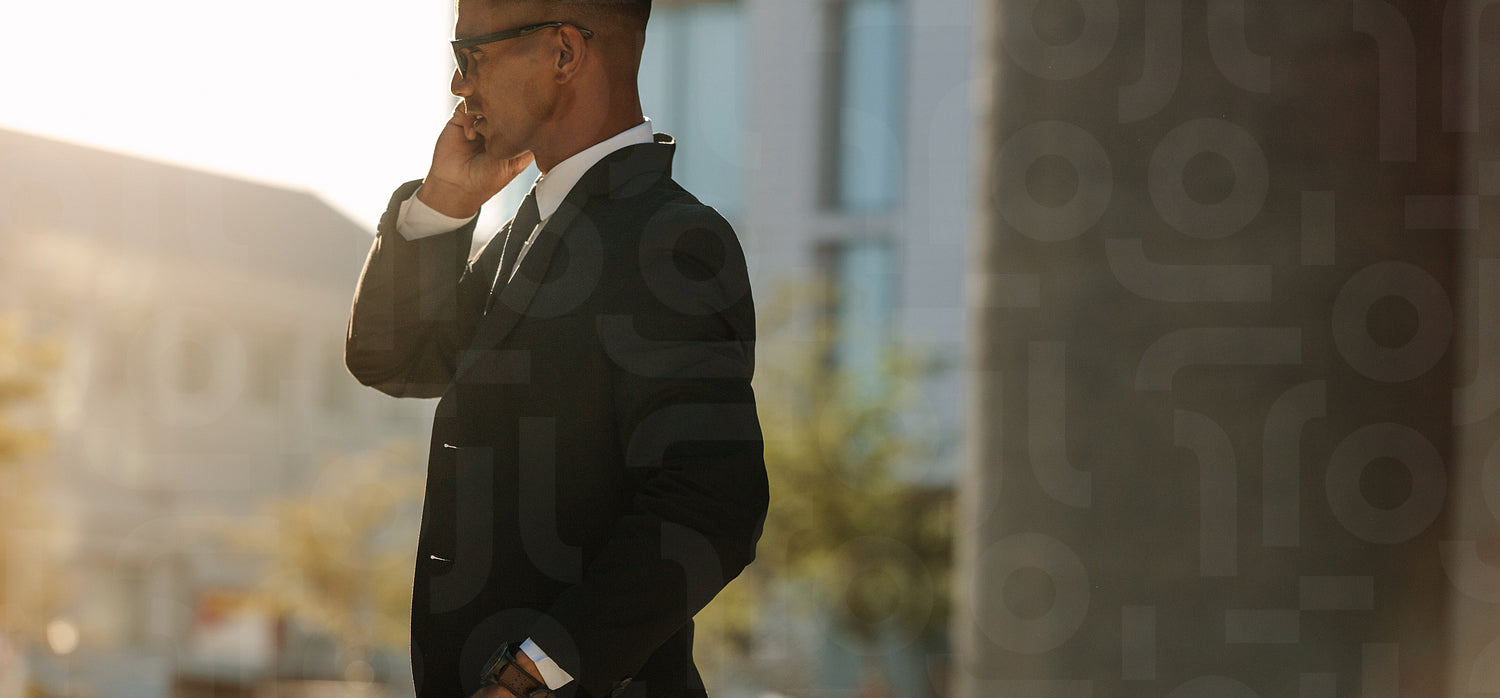 Businessman in formal clothes talking over mobile phone while walking on street. Busy office going person walking on street while talking on mobile phone.