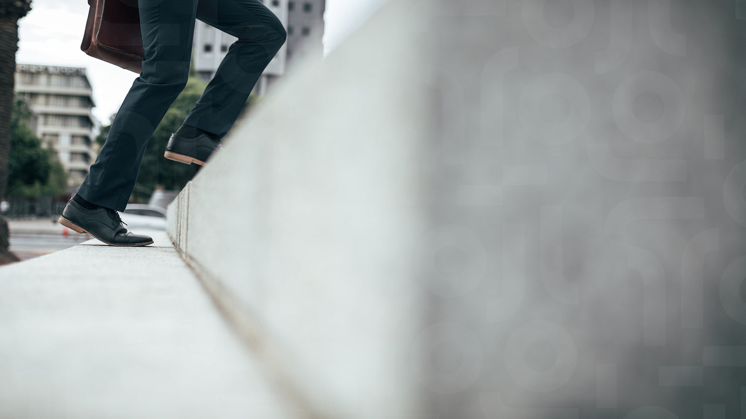 Low angle view of legs of man climbing up the steps outdoors. Legs of man wearing formal clothes and shoes carrying an office bag walking up the stairs.
