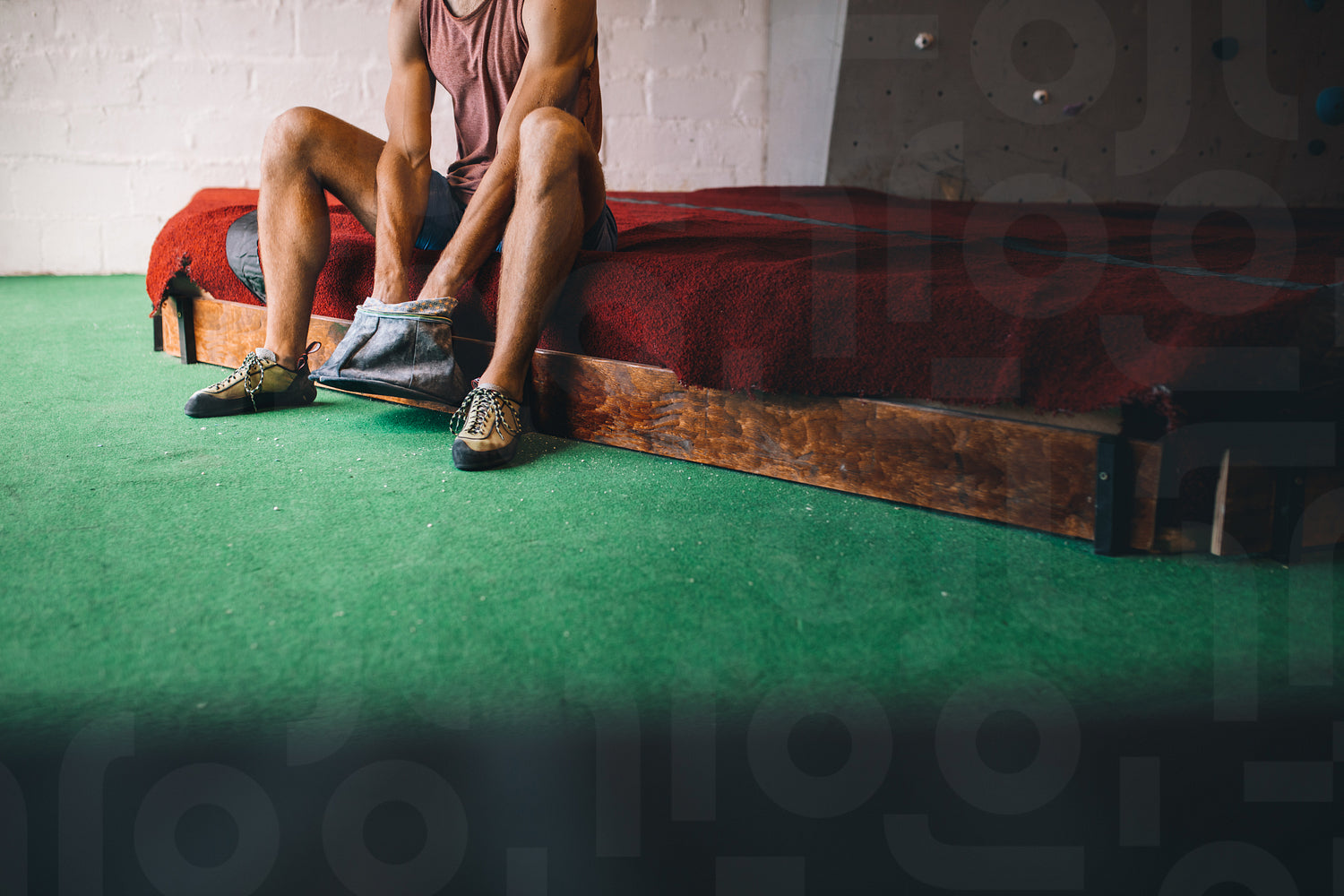 Cropped shot of man at a wall climbing gym applying magnesium chalk powder on hands from a bag.