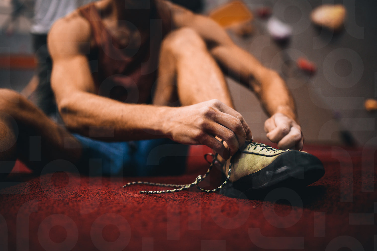 Cropped shot of man sitting on the floor and wearing griping shoes for wall climbing. Man tying shoe laces at a gym.
