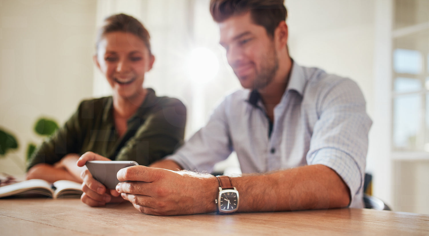 Shot of young man sitting with his girlfriend at table holding smart phone. Young couple at home using mobile phone. Focus on man hands holding mobile phone.