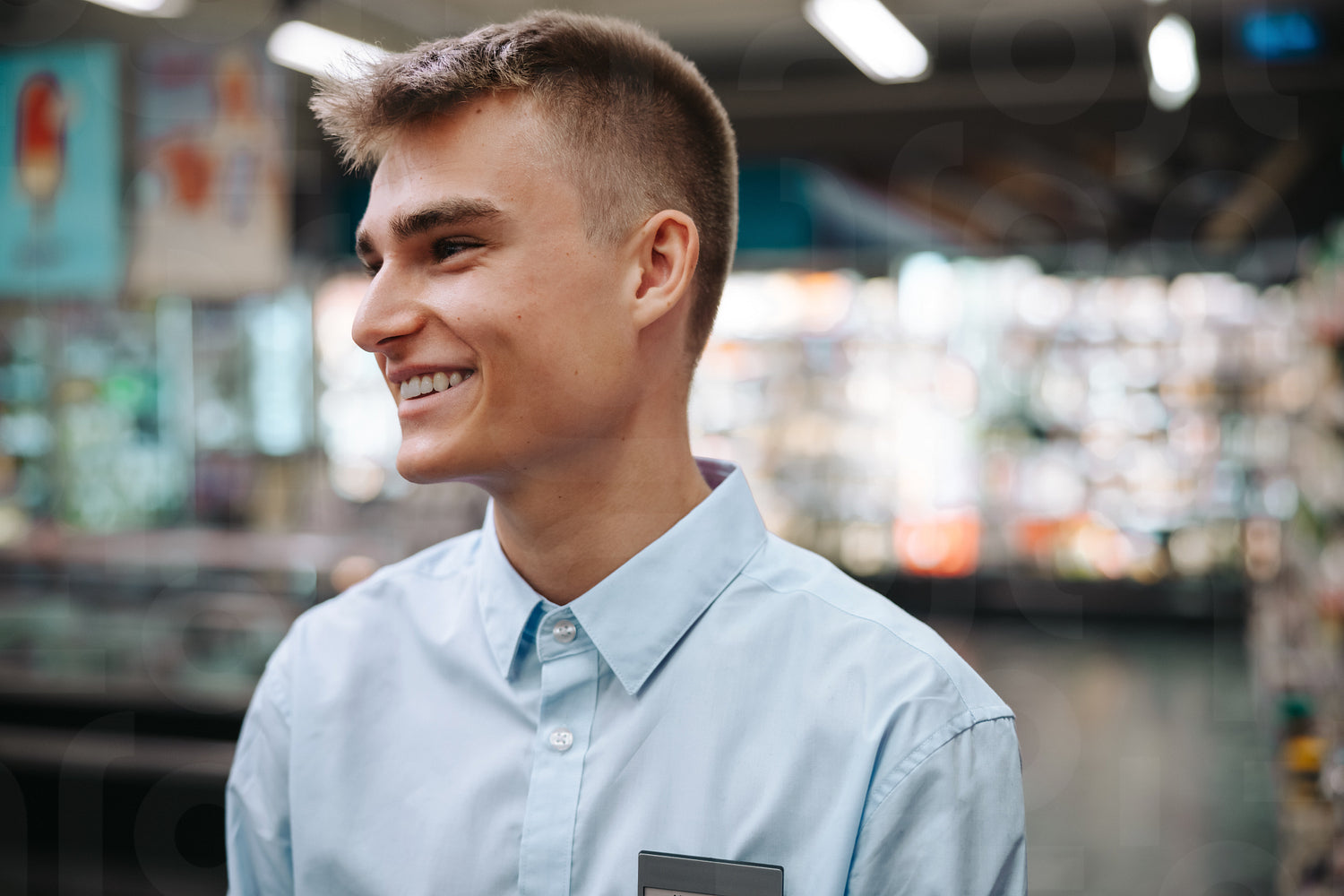 Close-up of a man working in a grocery store. Young worker looking away and smiling in supermarket.