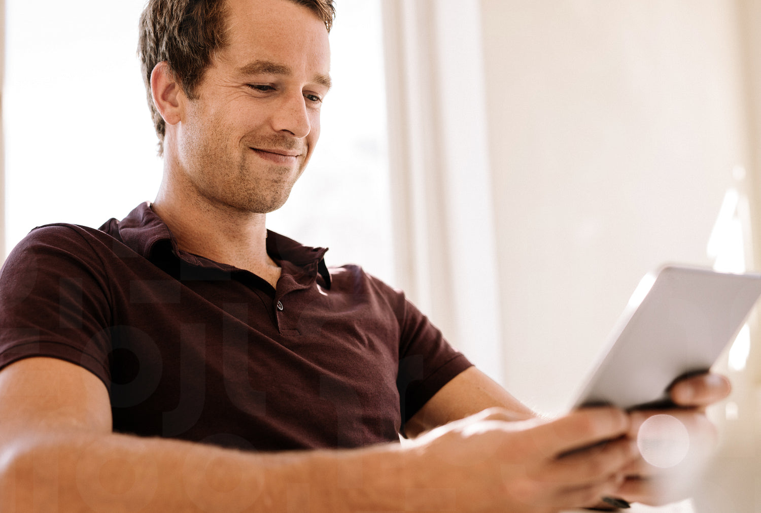 Entrepreneur operating digital tablet. Close up of a smiling man working on digital tablet.
