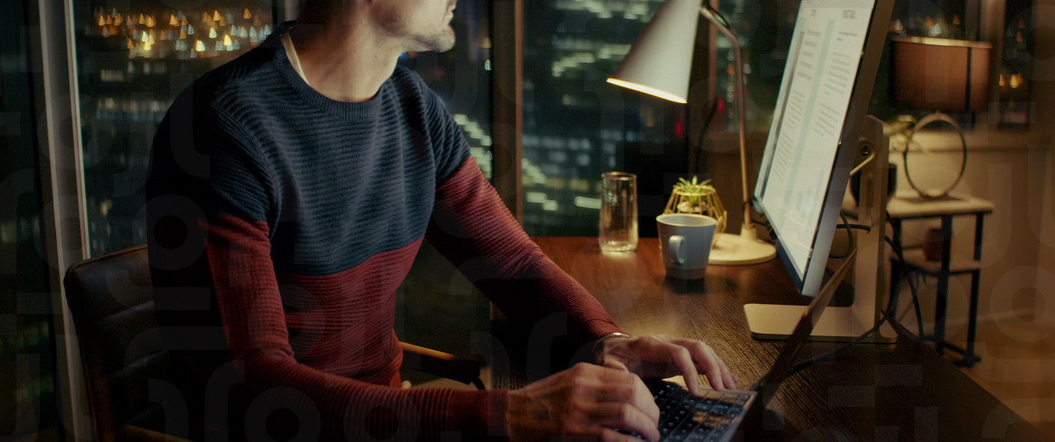 Man working late at night on his laptop to meet a deadline. He works in calm solitude, fully immersed as the empty office hums with late-night energy. Anamorphic lens in 2.39:1 Cinemascope format.