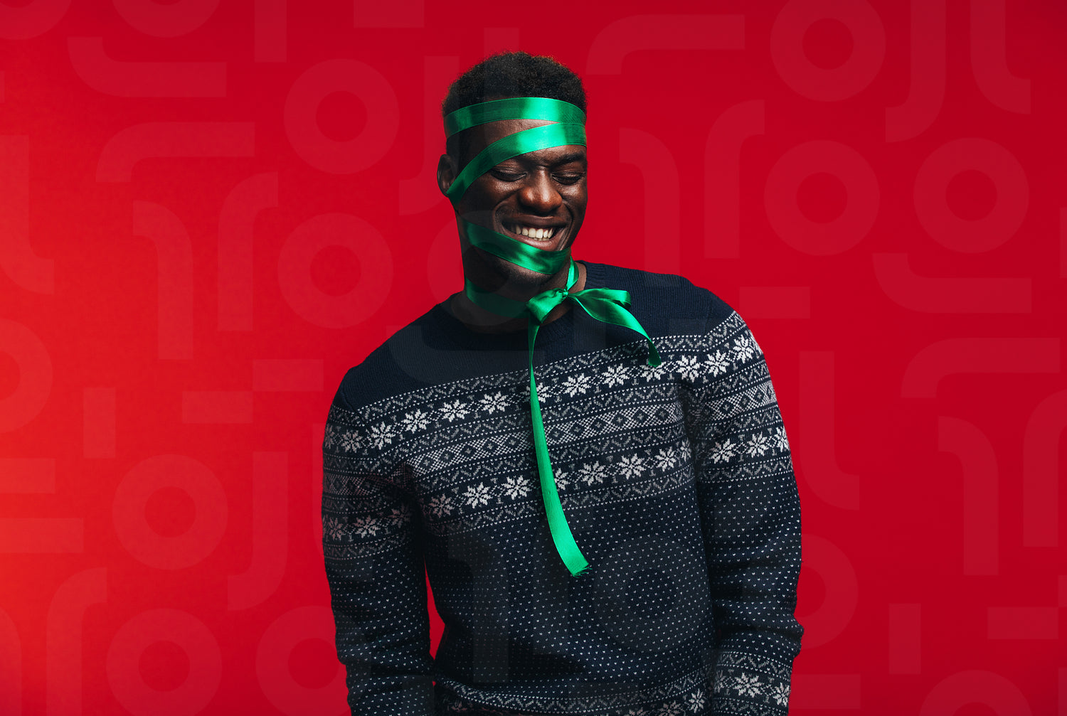Happy african man with satin ribbon tied on his face against red background. Man wrapped as a present.