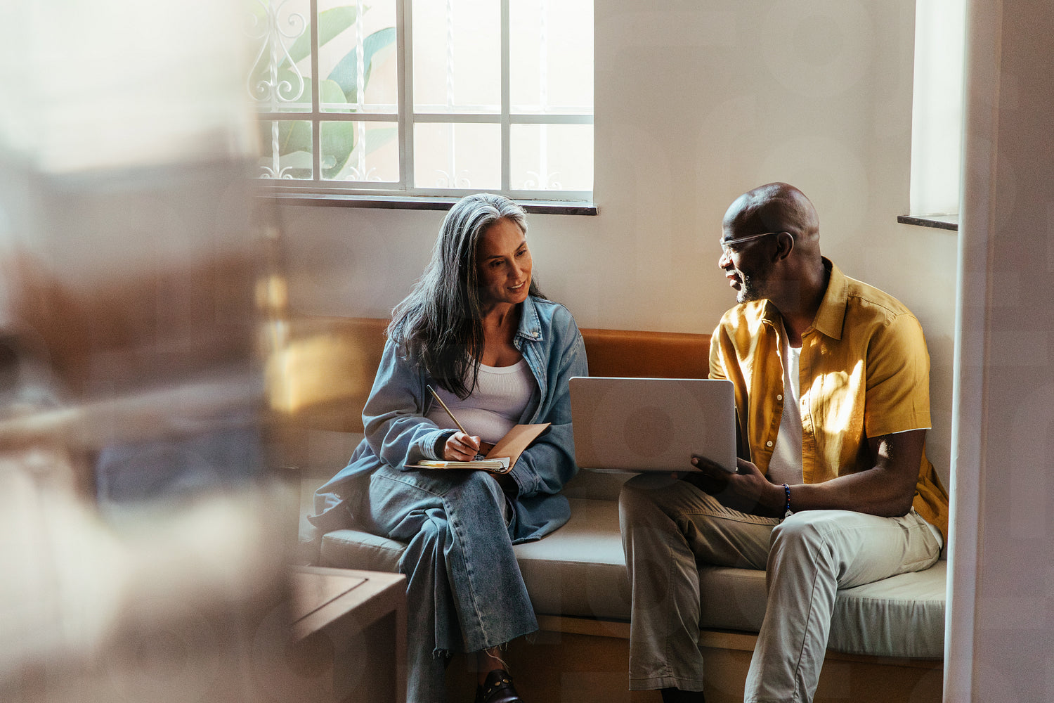 Manager and teammate collaborating on a project while sitting and discussing ideas with a laptop in a modern office environment.