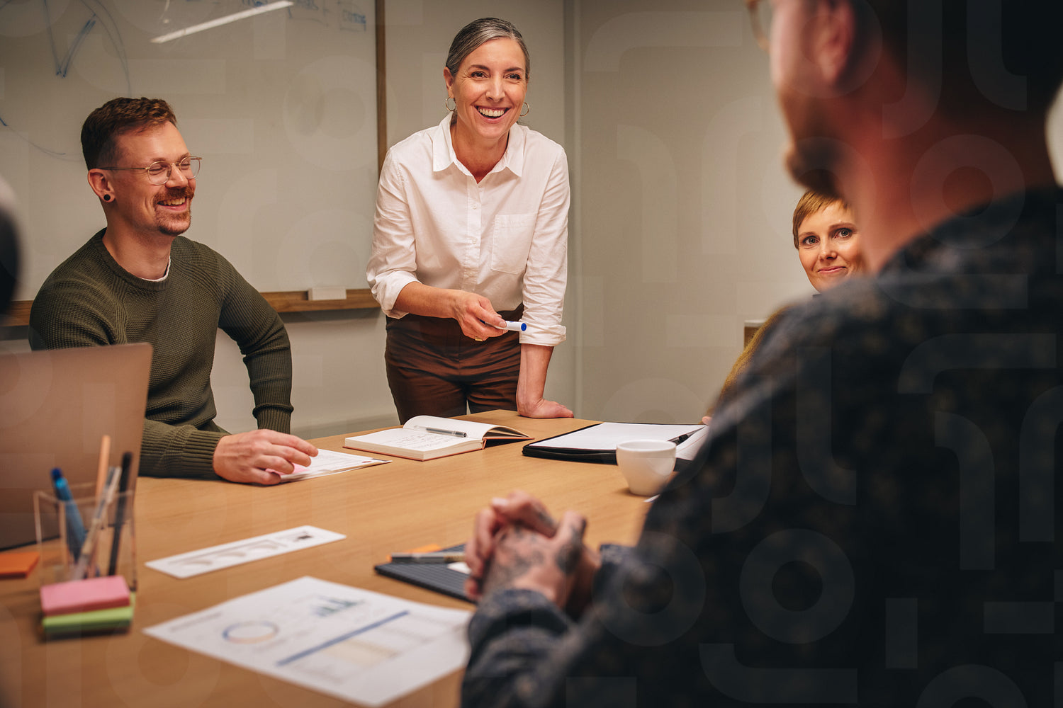 Executive female inviting questions after business presentation in boardroom meeting with colleagues. Manager explaining new project with colleagues in meeting.