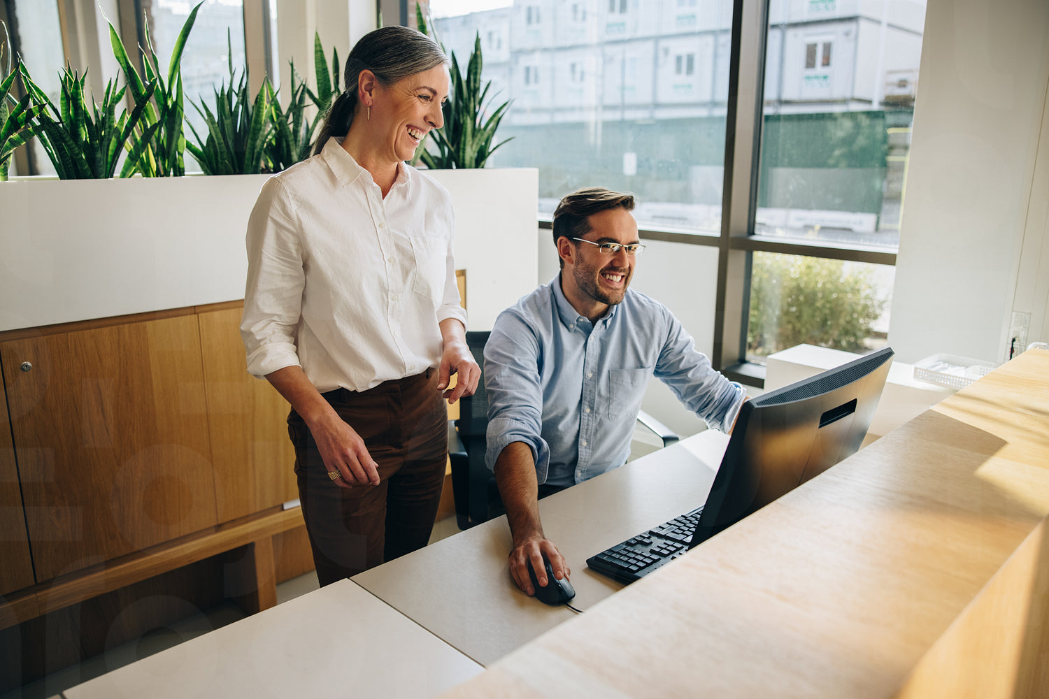 Happy female executive supervising her coworker work on computer. Manager and employee looking at computer and smiling.