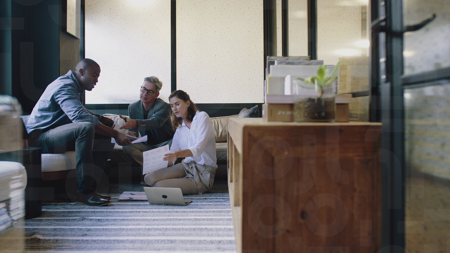 Business people sitting together and planning in a coworking office. Multiracial office colleagues discussing new marketing strategies in a meeting.