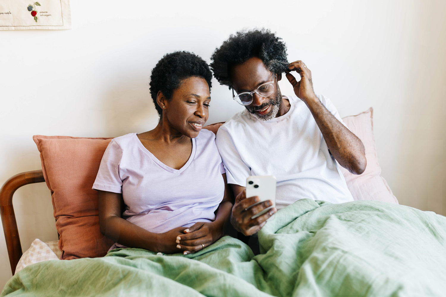 Mature, married couple sits on a bed, smiling as they browse social media on a smartphone. Enjoying quality time together in a cozy bedroom, they embody love, relaxation, and modern technology.
