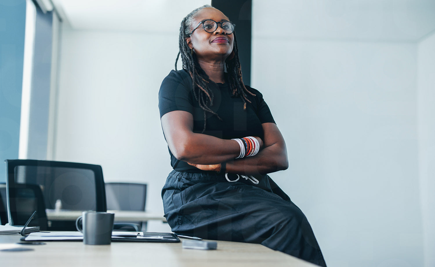 Mature professional woman sits in her office, deep in thought with her arms crossed. Black business woman wears a serious expression while contemplating a critical company decision.