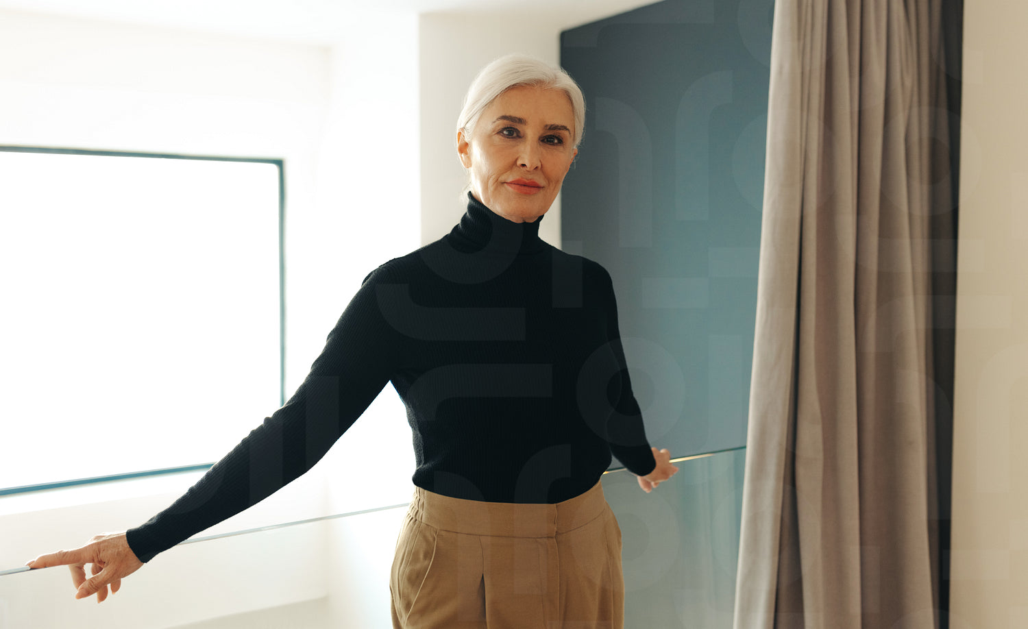 Mature and confident business woman stands on an interior office balcony, dressed in stylish and professional businesswear and giving out an air of authority and expertise.