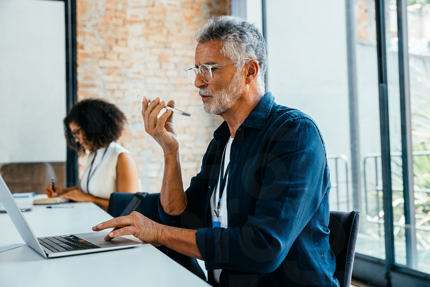 Mature professional speaking into phone while working on a laptop in a stylish office. Focused businessman in a collaborative workspace.