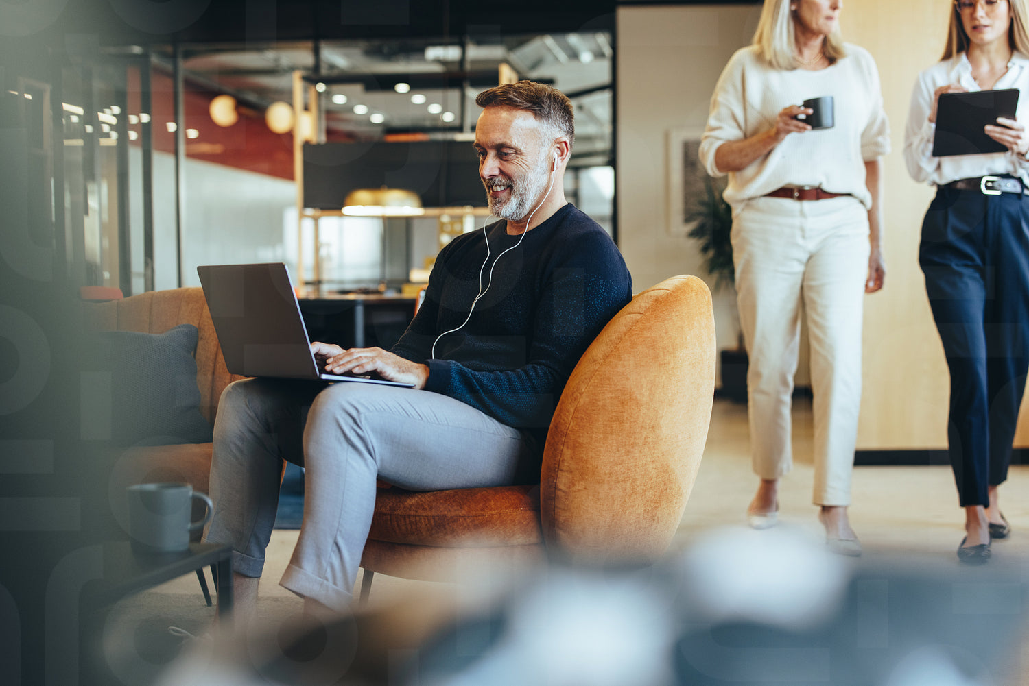 Mature businessman working in a co-working space. Happy mature businessman smiling while typing on a laptop and listening to music. Experienced businessman sitting on a couch in a modern workspace.